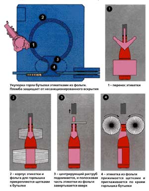 Два захватных цилиндра, специально разработанные для этой цели, прижимают пломбу, защищающую от несанкционированного вскрытия (заготовка из фольги толщиной 14 мкм), к бутылке. После того как пломба приглаживается щеткой внутри машины, устройство для размещения фольги покрывает пробку верхним участком этикетки, в то время как бутылка передается со стола для бутылок на разгрузочный круг в виде звезды,г де две вращающиеся щетки прижимают выдающийся конец этикетки вниз к пробке и бутылке. Вся операция сходна с процессом нанесения точечной фольги.