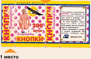 1 место. Цветной телевизор PHILIPS за первое место получил житель поселка Тумботино Павловского района Александр Павлович Квашук, приславший упаковку для канцелярских кнопок, на которой почему-то изображена обнаженная женская натура, а чуть ниже и сама кнопка с явным намеком уколоть или, лучше сказать, "приколоть", покупателя.