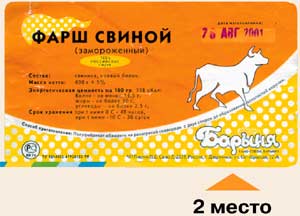 2 место. Приз за второе место - видеомагнитофон SAMSUNG - получил житель г. Дзержинска А. Б. Анисимов, приславший этикетку свиного фарша с изображением коровы. При этом в нижнем правом углу размещается имя животного "Барыня", потребителю остается только догадываться какого - свиньи или коровы и из кого собственно фарш.