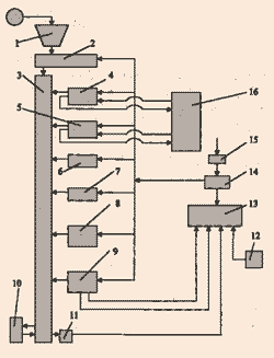 Основными структурными элементами упаковочных автоматов являются исполнительные механизмы, посредством которых выполняются заданные операции технологического процесса. Эти механизмы различаются по следующим видам: рабочие, загрузочные, установочные, транспортные и съемные. В соответствии с этим делением в исходной структуре вертикального фасовочно-упаковочного автомата на рисунке выделены следующие структурные элементы: 1 - бункер с загрузоч- ным транспортером; 2 - дозатор; 3 - устройство формирования рукава из упаковочного материала; 4 - устройство сварки продольного шва; 5 - устройство сварки поперечных швов; 6 - механизм образования пакета; 7 - механизм отрезания пакета; 8 - механизм прижима рукава к стволу; 9 - механизм протягивания рукава; 10 - устройство размотки рулона пленки; 11 - датчик метки; 12 - переключатель режима работы; 13 - блок контроля; 14 - распределитель; 15 - вход энергоносителя; 16 - блок управления и регулирования.