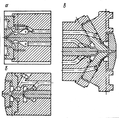 Рис. 2 Конструкции головок для экструзии 4 слоев плоской пленки с прямолинейными каналами и гибкими губками (а) и с прямолинейными каналами уменьшающего сечения и подпорными призмами (б, в)