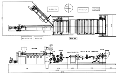 На рисунке 3 показано оборудование для экструзии двухслойной стретч-пленки фирмы "Чи Чэнг" (Тайвань). Оно имеет высокоточную систему контроля толщины, поэтому получаются высококачественные пленки с заданными параметрами. Оборудование оснащено системой обрезки кромок, автоматизированной станцией намотки пленки, гарантирующей высокое качество получаемых на оборудовании рулонов пленки. Данное оборудование состоит из двух экструдеров, расположенных под углом, экструзионной головки для двухслойной пленки. В России оборудование для экструзии плоских пленок не производится.