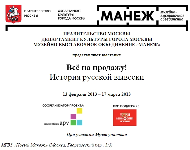 Культурно-историческая выставка «Всё на продажу! История русской вывески» представляет публике исследовательский проект, который объединил в едином пространстве около 300 экспонатов: оригинальные вывески, живопись, графику, объекты конца XIX – начала XX в. – яркого периода развития и совершенствования русской изобразительной вывески, времени формирования ее характерного образа и настроения. Выставка собрана из фондов Государственного музея В.В. Маяковского, Государственного музея истории Санкт-Петербурга, Государственной Третьяковской галереи, Исторического музея, Музея Москвы, Московского Музея современного искусства, Музея Упаковки, галереи «Антик-Маркет» и частных коллекций.