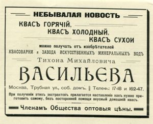- коллекционеров этикеток и бутылок для кваса (в коллекции Музея упаковки, архивы которого хранятся в редакции журнала "Тара и упаковка", есть коллекция этикеток для кваса XIХ - XX веков (около 100 шт.). Демонстрация и опубликование альбома таких этикеток безусловно значительно повысит ценность этого напитка. И, кстати они могут быть использованы в качестве "традиционных" образцов для современного дизайна этикеток, т.е. для современных российских производителей напитка.